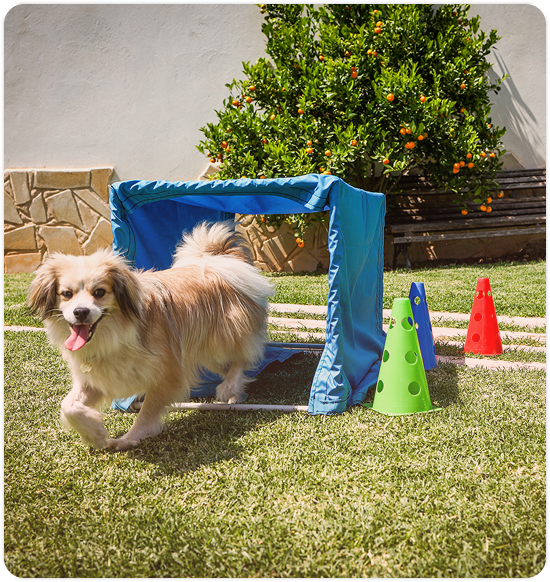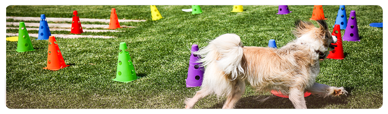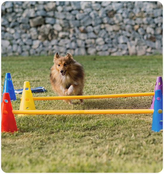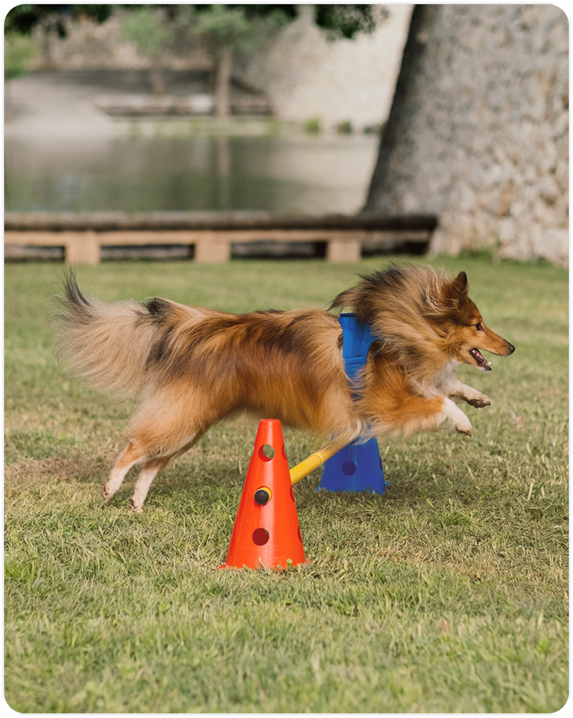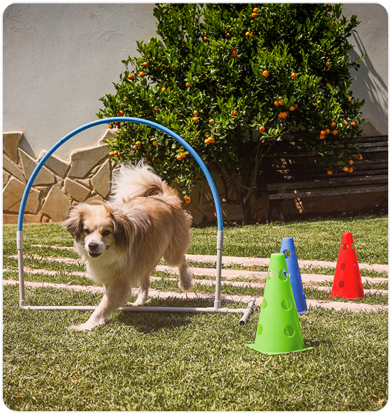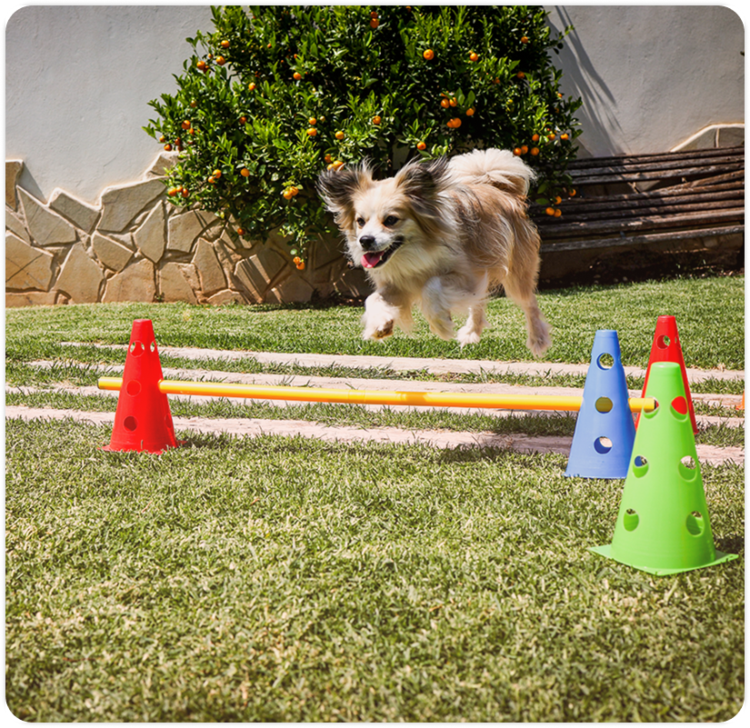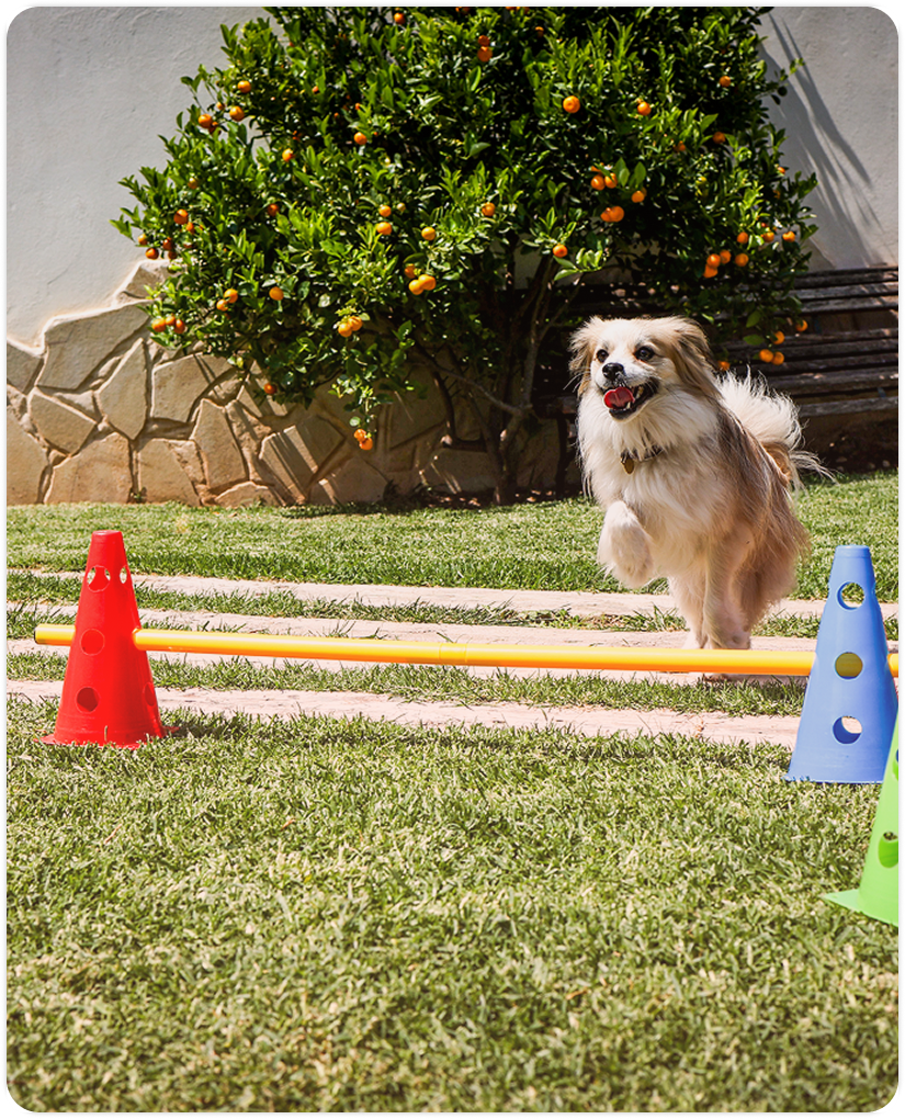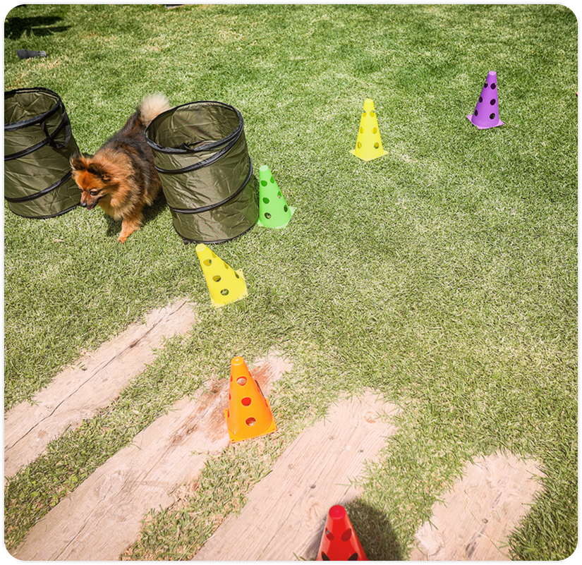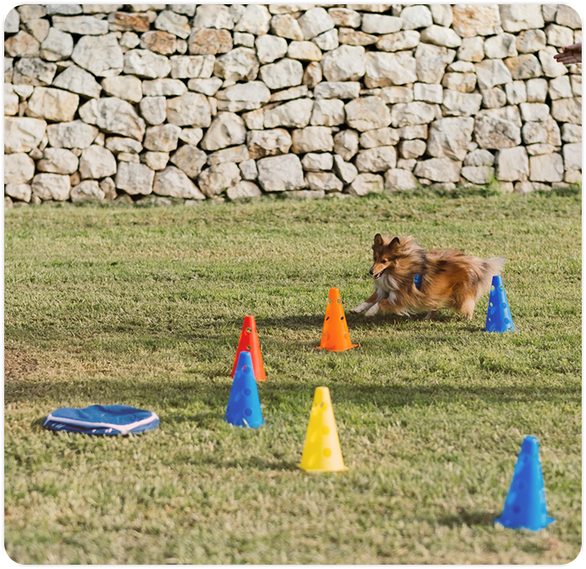 - Diversification : découvrir différents obstacles et différentes commandes (saut, tunnel, tricks sur la cible, passer entre des objets, passer derrière un objet, faire demi-tour autour d’un baril, monter sur une plateforme….)